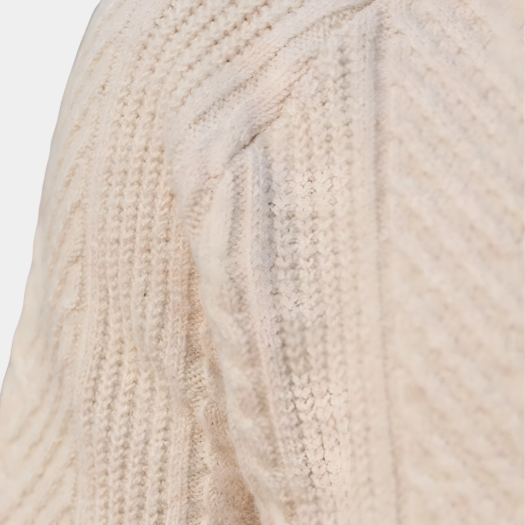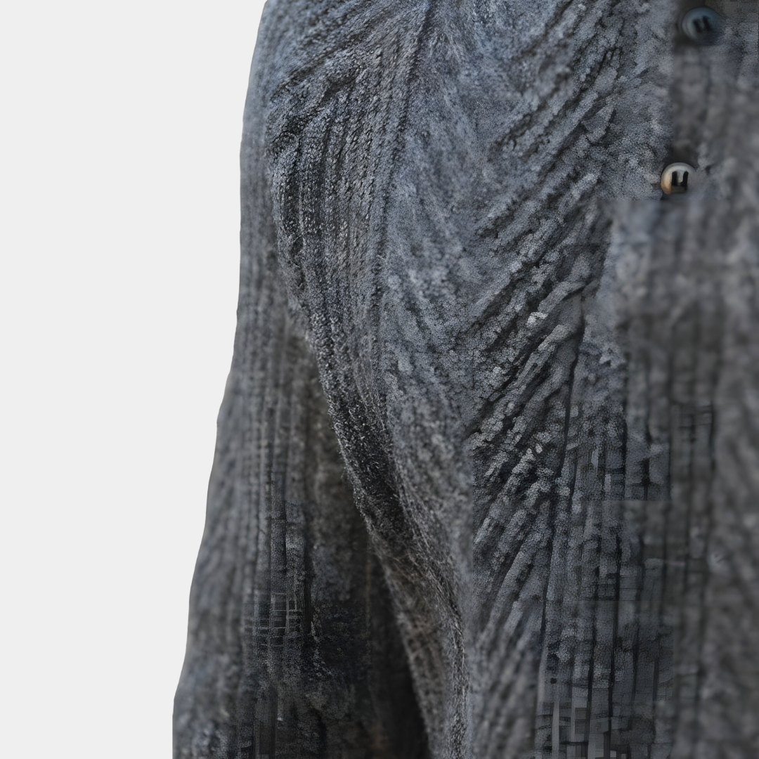 Cubierto de un elegante dibujo de espiga, este jersey presenta un cuello tradicional y una tapeta de botones que le dan un toque de sutil encanto. Tejido con materiales de alta calidad, este jersey es una sofisticada mezcla de cálido confort y estilo clásico.