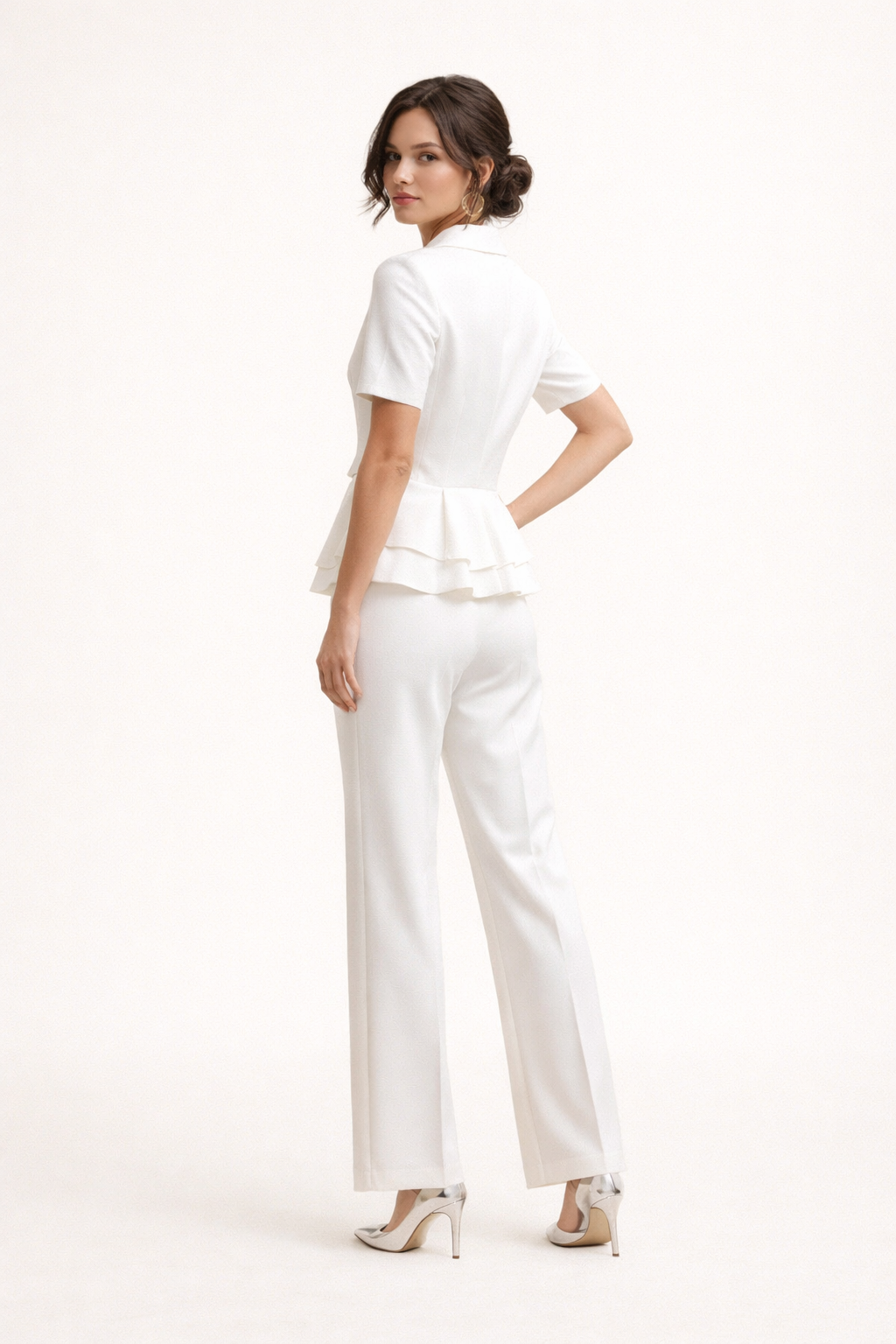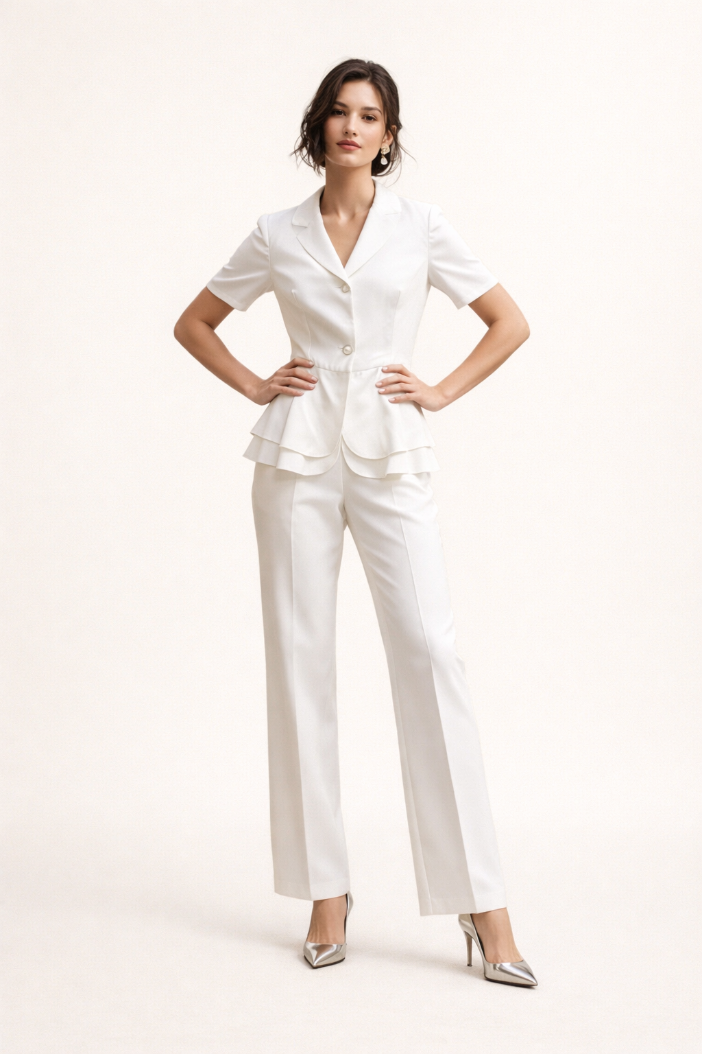 Conjunto de mujer Kreszenz con blazer entallado de manga corta y pantalón recto que estiliza la figura con una línea definida y pulida. La cintura marcada aporta mejor forma visual que otras opciones sueltas, mientras el corte sastre transmite orden y elegancia. Resuelve el look completo en una sola prenda y funciona muy bien en oficina, reuniones, celebraciones o cenas.